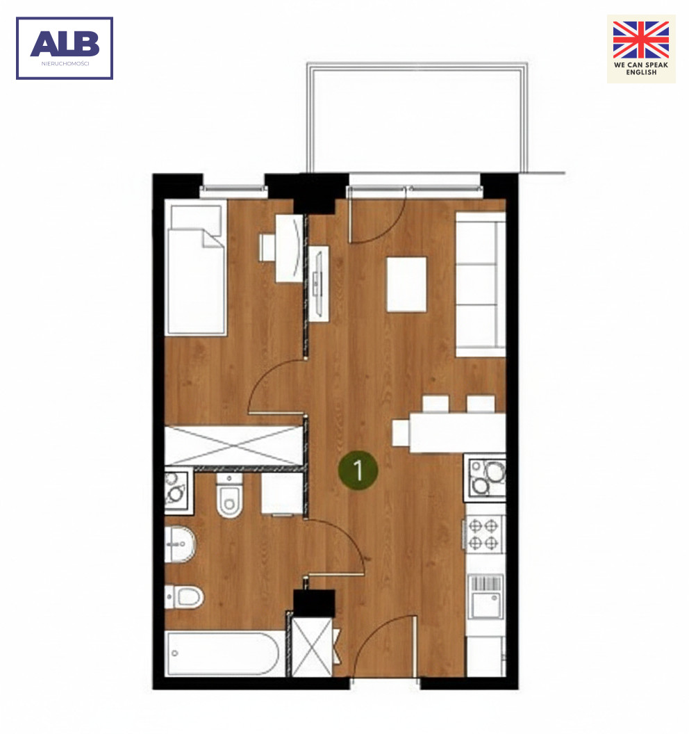 - słoneczny salon z aneksem kuchennym (ekspozycja zachodnia z lekkim południem)