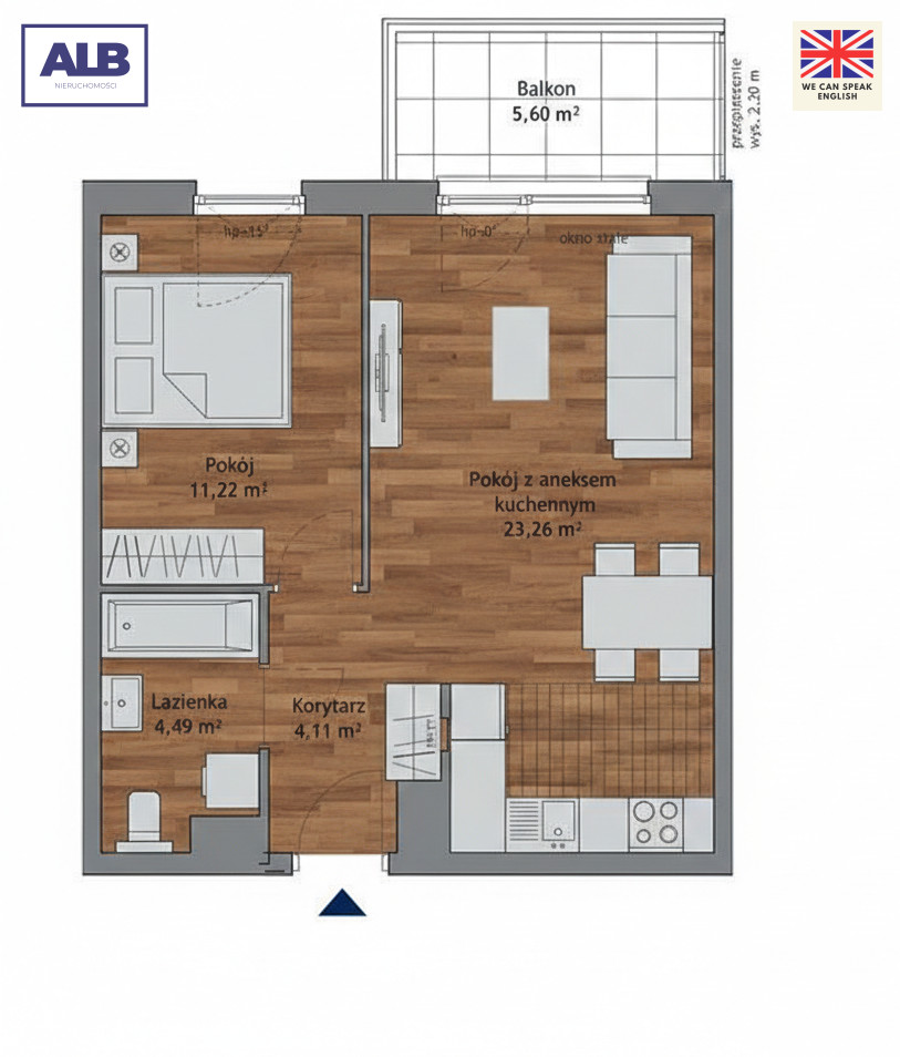 - jasny salon z aneksem kuchennym (23,26 m2 i ekspozycja wschodnia)