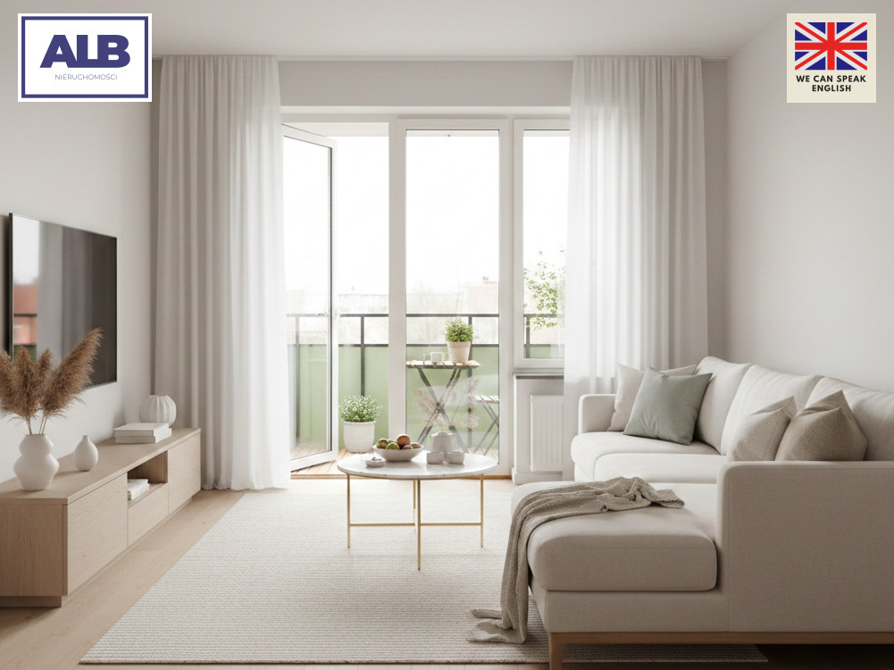 - narożny, słoneczny salon z aneksem kuchennym (20,54 m2 z oknem w części kuchennej)