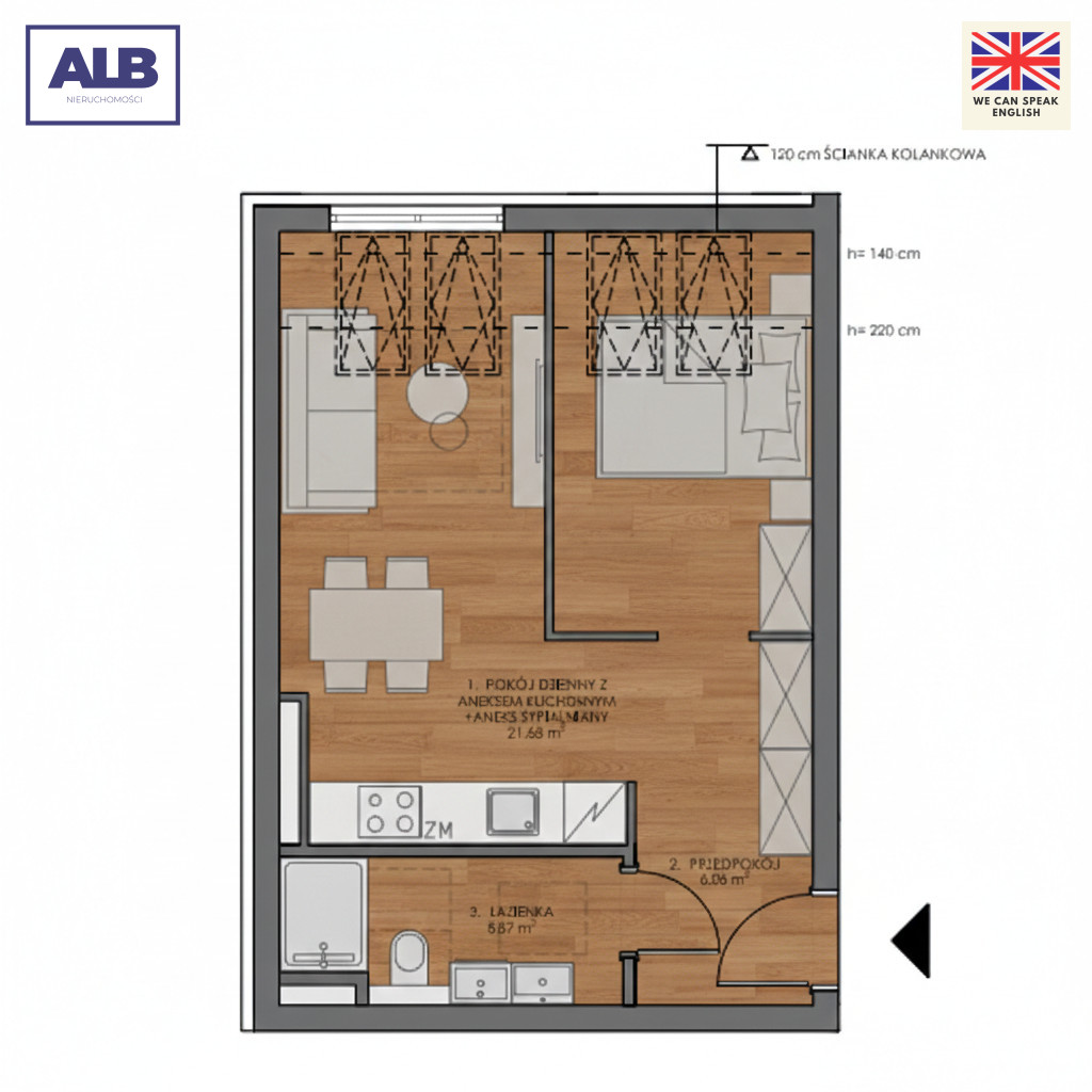 - słoneczny salon z aneksem kuchennym oraz wydzieloną częścią sypialnianą (21,68 m2 i ekspozycja wschodnia),
